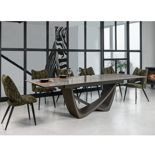 Стільниця поєднує матову кераміку та гартоване скло, що робить її дуже міцною та стійкою до подряпин, тепла, і навіть випадкових пошкоджень. Фарбований метал основи також додає стійкості та надійності конструкції.