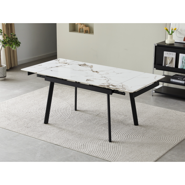 Завдяки боковому механізму розкладання стіл легко збільшується з 120 до 180 см, забезпечуючи комфорт як у щоденному використанні, так і під час святкових зустрічей. Стільниця з глянцевої кераміки стійка до високих температур, а металева основа гарантує надійність та довговічність.