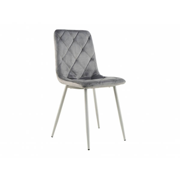 Стілець поєднує світло-сірий велюр з білим фарбованим металевим каркасом, створюючи гармонійний і витончений вигляд. Світло-сірий колір оббивки додає інтер'єру м'якості і спокою, а білий металевий каркас підкреслює чистоту ліній і додає легкості. Така комбінація ідеально підходить для сучасних інтер'єрів, доповнюючи як мінімалістичні, так і більш класичні стилі.