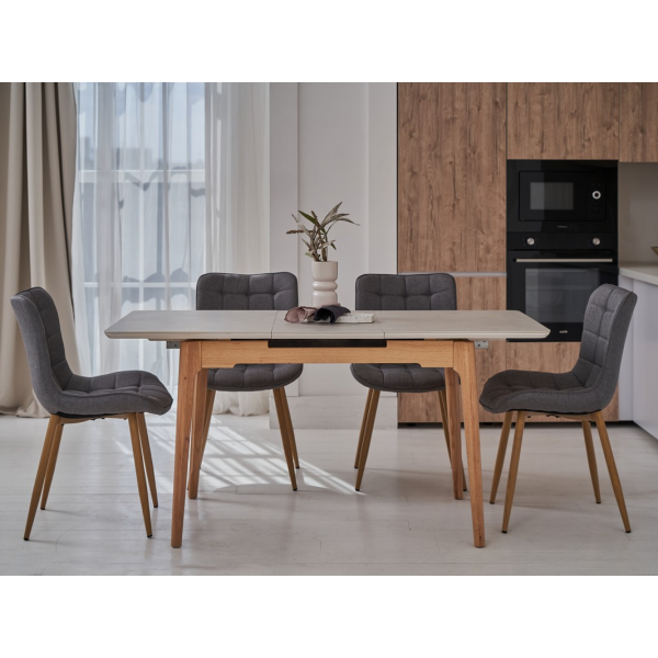 Столешня виготовлена з матової кераміки, що робить її міцною та стійкою до подряпин та впливу вологи. Керамічна стільниця надає столу сучасний вигляд і легко чиститься.