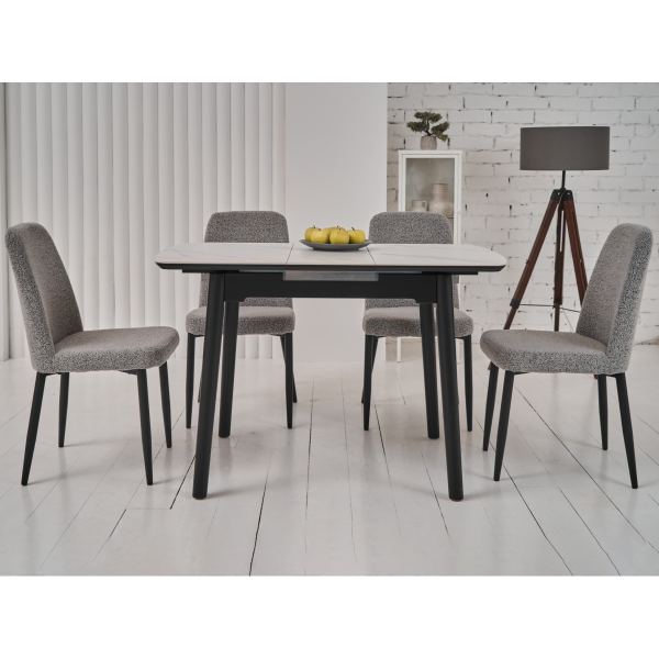 Стільниця та вкладка виготовлені з матової кераміки та матового МДФ, що надає їм елегантного та сучасного вигляду. Колір «білий мармур» імітує природний камінь з його характерними прожилками і відтінками, додаючи столу вишуканості. Матова поверхня запобігає появі блисків, створюючи м’яку та затишну атмосферу.