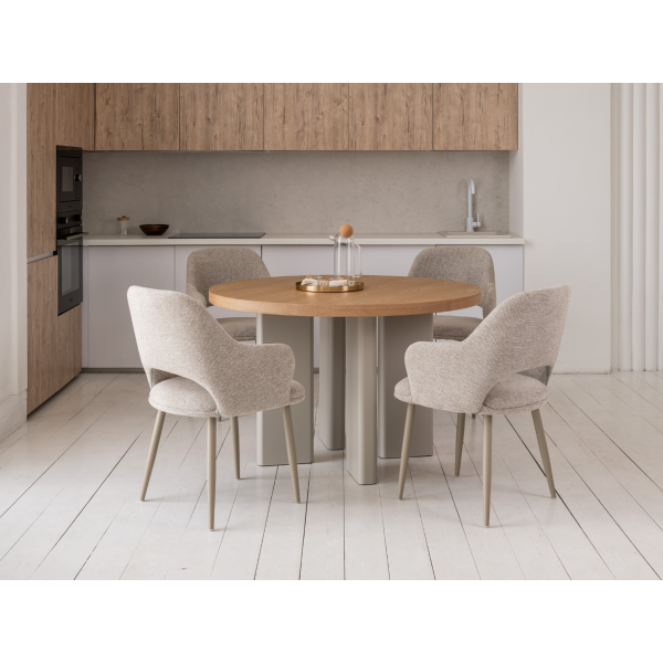 Кругла стільниця діаметром 120 см виготовлена зі шпонованого МДФ у відтінку “ясень”, що додає виробу природного шарму та тепла.