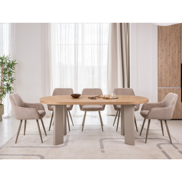 Овальна стільниця розміром 200 × 90 см виготовлена зі шпонованого МДФ у відтінку "ясень", що надає виробу натурального вигляду та тепла.