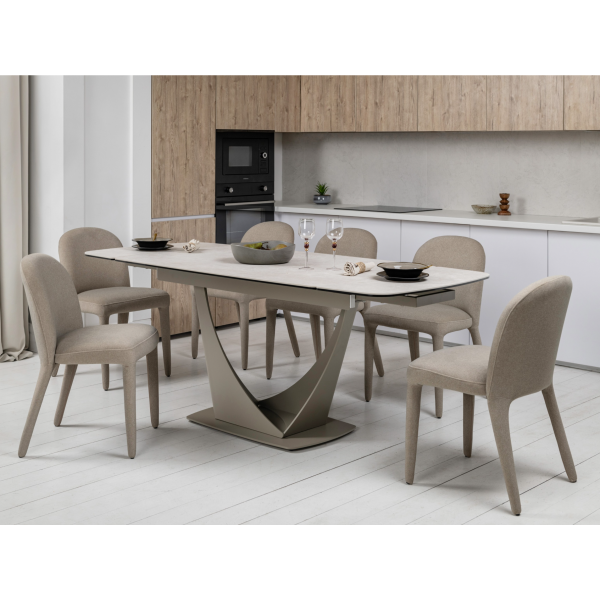 Колір "сахара" і бежевий відтінок основи роблять цей стіл витонченим і універсальним. Матова поверхня керамічної стільниці додає сучасного вигляду й легко поєднується з іншими елементами інтер'єру.