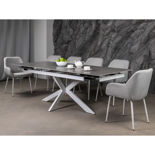 Керамічний стіл Тіціано TML-1150 делікато грей + білий – це поєднання вишуканого дизайну та практичності. Його прямокутна форма гармонійно виглядає у сучасних інтер’єрах, а розкладний механізм із боковим розширенням дозволяє збільшувати довжину стільниці з 170 до 220 см, забезпечуючи комфорт для великих компаній.