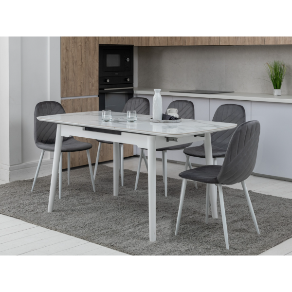 Столешня виготовлена з глянцевої кераміки та матового МДФ, а вкладка - з глянцевої кераміки та матового МДФ. Основа столу виконана з фарбованого дерева, що забезпечує міцність та стійкість.