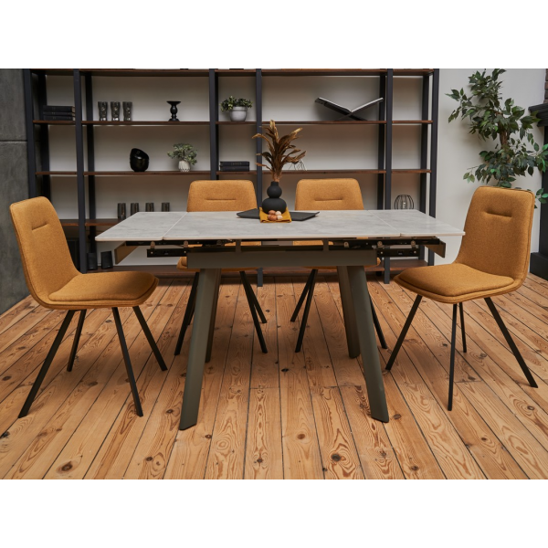 Керамічний стіл TM-80 у кольорі вера грей — це стильне та практичне рішення для сучасної кухні чи їдальні. Його стільниця виготовлена з матової кераміки, що вирізняється стійкістю до подряпин, температурних перепадів та легкістю у догляді. Прямокутна форма та компактні розміри (90×75 см) ідеально підходять для щоденного використання, а завдяки боковому механізму розкладки стіл можна швидко розширити до 140 см, забезпечуючи комфортне розміщення більшої кількості гостей. Міцна основа з фарбованого металу додає конструкції стабільності та довговічності.