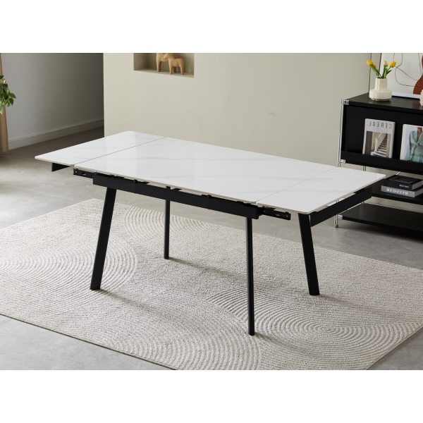 Завдяки боковому механізму розкладання стіл легко трансформується з 120 до 180 см, забезпечуючи достатньо місця для щоденного використання або святкових застіль у колі близьких. Стільниця з глянцевої кераміки вирізняється стійкістю до високих температур, що робить її практичною та довговічною. Міцна металева основа гарантує надійність конструкції та стабільність у щоденному користуванні.
