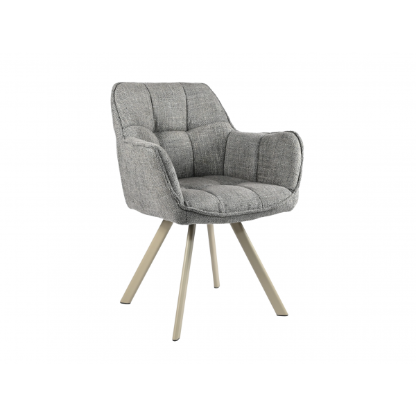 Широке сидіння (61 см) і зручні підлокітники забезпечують комфорт навіть при тривалому сидінні. Металева фарбована основа в кольорі капучино додає тепла та гармонії в загальний дизайн. Витончений контраст між сірим агатом та капучино створює чудову композицію, яка буде гармонійно виглядати як у вітальні, так і в обідній зоні або зоні відпочинку.