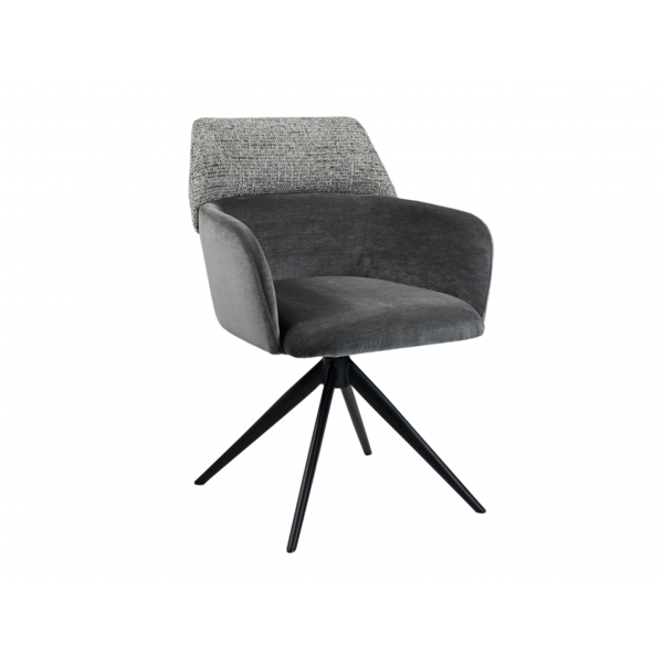 Модель має обертальну функцію на 360° з автоповоротом, що дозволяє з легкістю змінювати напрямок без потреби вставати. Оббивка з шеніллу в попільному кольорі додає стільцю м'якість і текстурну глибину, створюючи затишну атмосферу. Це кольорове рішення є універсальним і додає елегантності, чудово поєднуючись з чорними металевими ніжками, що надають конструкції стабільності.