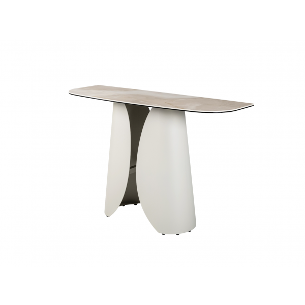 Металева основа, пофарбована в тон айворі, додає конструкції візуальної легкості, стабільності та сучасного шарму. Завдяки продуманим пропорціям, консоль виглядає витончено, але водночас зберігає практичність — на ній зручно розміщувати декор, книги чи освітлення.